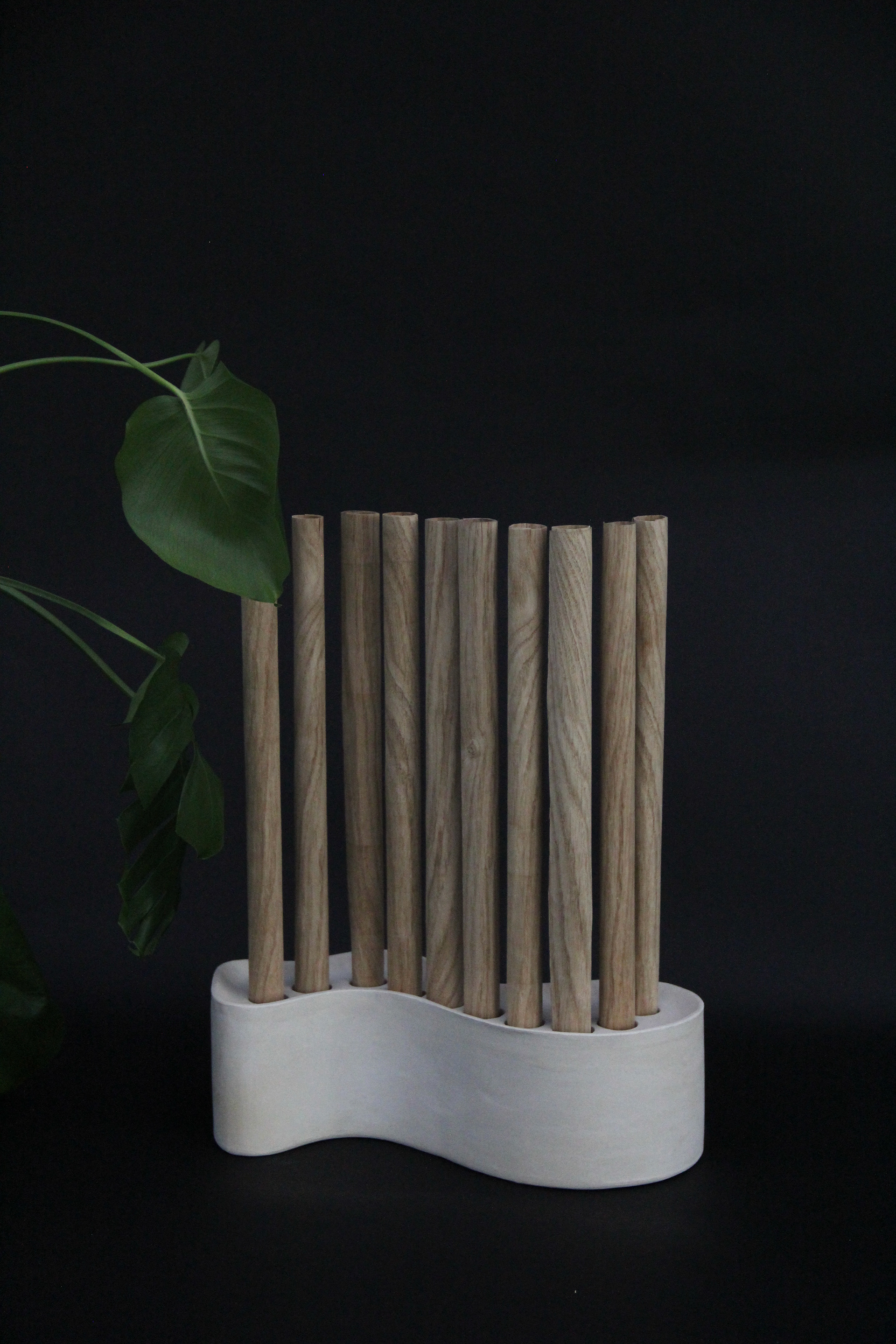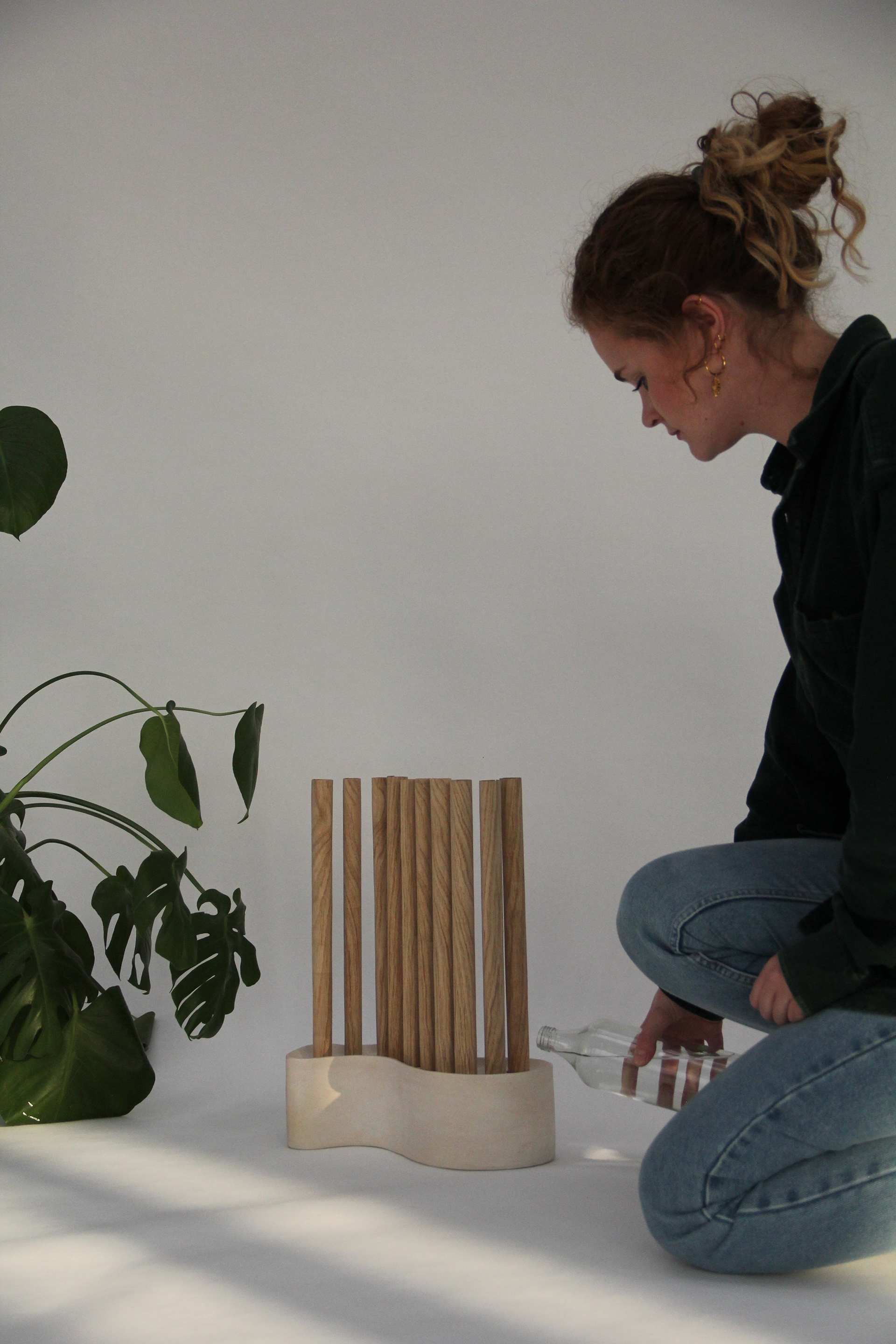 The water tank, made of ceramic, has an amorphous shape, which is felt after the abstracted shape of coral. At the top of the tank are ten round holes, which are intended for the ten moisture sticks. Experiments showed the best result with the oak veneer, so the moisture sticks are made of this rolled wood.